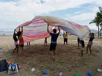 Começando apenas por abaixar e levantar inflando o pano, após isso tinha a troca de lugares entre participantes, de um lado a outro do pano, em seguida trocava-se a pessoa que ficava no centro, tendo como objetivo não deixar o centro vazio, simbolizando ainda mais o sentido de cooperação. Também ergueram crianças uma a uma, o que trouxe sorrisos gigantes das crianças.