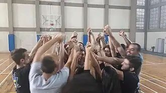 Professor espalhou bambolês pela quadra, juntaram-se em duplas. A dupla de fora foi dividido em participante um: joga a bola para o segundo, o segundo participante batia na bola ou chutava e falava o nome de algum aluno. Quando o segundo participante da dupla falava o nome, todos os alunos tinham que correr pela quadra com sua dupla e achar um bambolê para ficar. O aluno chamado, se conseguisse, tinha que pegar a bola e ir correndo para um dos bambolês, se desse certo, a dupla que ficou de fora tinha que fazer a mesma coisa, como um ciclo, arremessar e bater na bola. A dupla tinha que manter de mão dada durante todo jogo e a rodada.