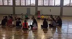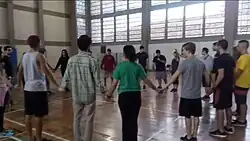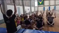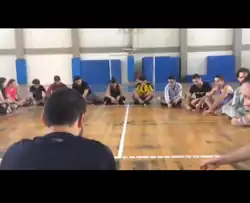 .A brincadeira seguinte era a brincadeira do Maia, onde cada aluno era caracterizado por um número, quando o professor chamasse o número, o aluno escolhido teria que “desmaiar” e o restante dos alunos o seguravam. Uma intervenção que foi feita durante a realização da brincadeira foi para que todos os participantes fossem próximo ao colchão para que o “desmaio” fosse mais seguro, depois ao decorrer da brincadeira começou a ser chamados dois números, onde os dois alunos deveriam "desmaiar" juntos.