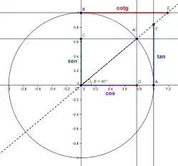 Estas funções também podem ser vistas em um círculo trigonométrico (circunferência de raio 1, e centro na origem do sistema cartesiano), como pode ser visto na figura abaixo, feita com o uso do software GeoGebra.
