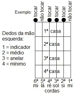 - A cifra: E = mi / A = lá / D = ré / G = sol / B = si / E = mi . Visualizando da 6ª para a 1ª corda, da corda grossa para a fina, de cima para baixo (com o violão ao colo).