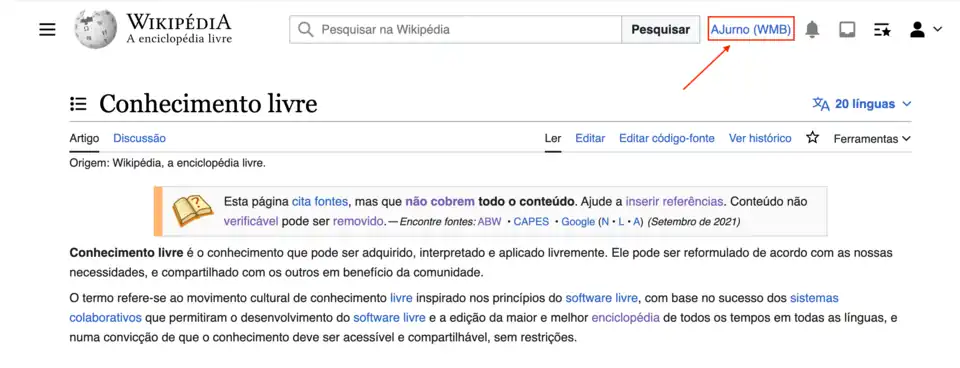 Antes de começar a editar, é importante certificar-se de estar logado. Ao entrar com seu usuário e senha, seu nome de usuário aparece como um link no topo superior direito da tela, tal como indicado em destaque vermelho na imagem abaixo. Quando não, neste mesmo espaço da página, aparecerão duas opções: criar uma conta e entrar. Faça o login e evite que suas edições sejam revertidas ou perdidas.
