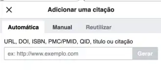 Ao clicar, você terá três opções: Automática, Manual e Reutilizar. Na aba "Automática", basta inserir um link externo, o DOI de um artigo, o ISBN de um livro, o PMC/PMID do trabalho, o QID do item do Wikidata, o título ou citação de um trabalho, por exemplo, e a Wikipédia irá gerar uma referência de forma automática. Em "Manual" é possível adicionar a referência inserindo todos os dados referentes ao trabalho que deseja referenciar. Em "Reutilizar" irá encontrar uma lista de todas as referências usadas naquele verbete para selecionar a que deseja reutilizar. Dessa forma, é possível citar o mesmo trabalho várias vezes sem ter que inserir os dados novamente. Para mais informações sobre a inserção de referências, acesse esse Guia do Editor Visual - Referências ou esse Guia de Citações, ambos criados pela comunidade wikimedista. Para editar uma referência existente, pressione onde ela aparece no texto (geralmente como um número entre colchetes). Você verá uma janela com as informações da referência em questão. Clique no botão “Editar”, no topo superior direito da janela, e abrirá uma caixa de diálogo onde poderá editar a referência. Ao publicar suas alterações, as referências serão automaticamente inseridas no fim da página. Contudo, caso esteja começando um novo verbete, é uma boa prática inserir um título de seção escrito "Referências" no formato "Cabeçalho", no fim de página. Uma outra opção, mais recomendada, é clicar no menu "Inserir", depois no ícone de "Predefinição" e buscar por "Referências". Ao inserir essa predefinição no fim da página, ela produz o título da seção de referências e impede que seja editável. |