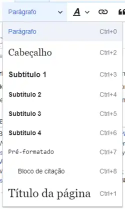 - ↑ Help:Editor Visual/Guia do usuário - MediaWiki» www.mediawiki.org (em inglês). Disponível em: https://www.mediawiki.org/wiki/Help:VisualEditor/User_guide/pt-br#.Consultado em 19 de julho de 2023