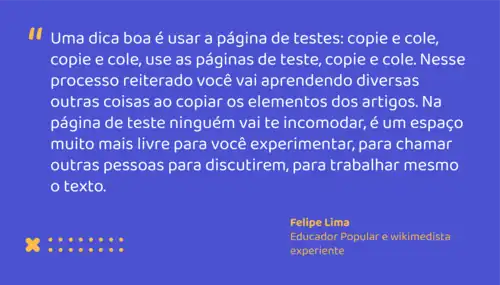 Uma das grandes vantagens da edição na Wikipédia é que não é preciso saber editar muito bem para começar, nem para continuar editando. Pelo contrário, é na rotina de realização de pequenas edições que você vai aprendendo e ganhando confiança para aumentar as suas contribuições. Não tenha medo de experimentar, especialmente em suas páginas de teste.