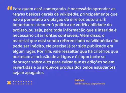 Caso queira saber mais detalhes, acesse as Políticas e recomendações e a Lista completa de recomendações. A seguir, preparamos um apanhado de informações que você deve saber antes de começar a editar e a estimular seus estudantes a fazer o mesmo na Wikipédia.