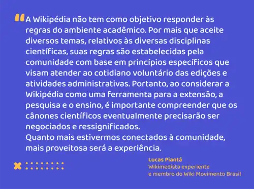 *O conteúdo desta unidade foi baseado em e/ou traduzido do programa "How to teach with Wikipedia", desenvolvido pela WikiEdu – uma organização que serve de ponte entre a Academia e a Wikipédia, do programa "Reading Wikipedia in the Classroom" – desenvolvido pelo time de Educação da Fundação Wikimedia, da série "Enseñar con Wikipedia" – uma iniciativa do Programa de Educación y Derechos Humanos da Wikimedia Argentina,e do verbete Wikipédia:Cinco Pilares, da Wikipédia Lusófona.