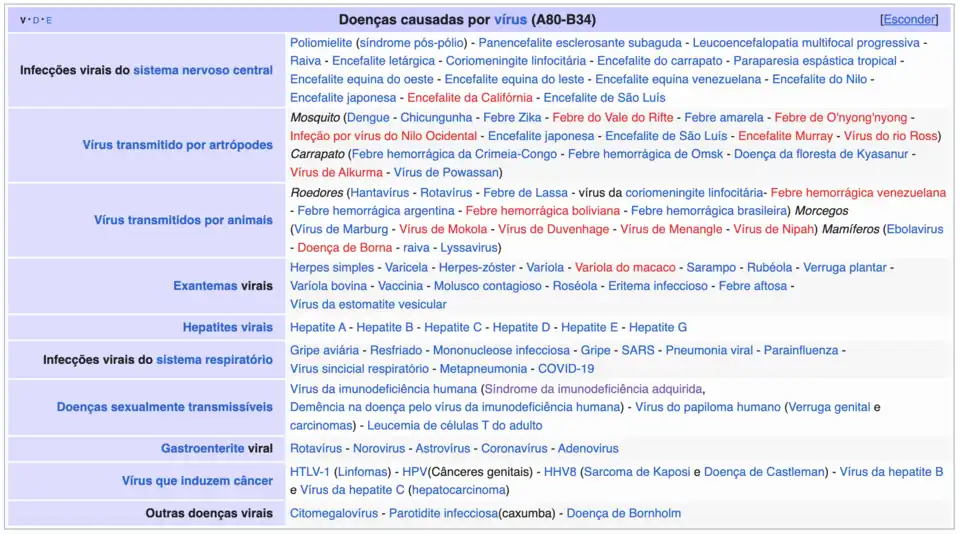 Às vezes, os verbetes têm caixas de navegação, como esta retratada na imagem sobre "Doenças causadas por vírus". Geralmente encontradas no final de um artigo, fornecem uma visão geral e rápida sobre uma categoria da Wikipédia, além de destacar artigos ausentes (links vermelhos). Por padrão, as caixas aparecem "escondidas" nos verbetes, mas basta clicar em "[Expandir]" no topo superior direito da caixa para expandi-la e observar seu conteúdo.