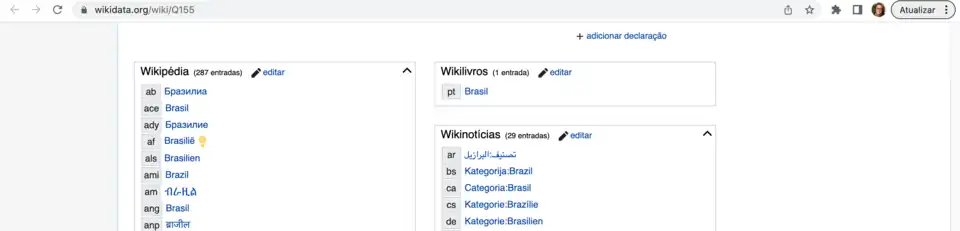 Abaixo das declarações, vemos o nome de cada um dos projetos Wikimedia (conforme mostrado na imagem abaixo). É possível criar uma ligação entre todas as versões existentes nos outros projetos Wikimedia relativas ao item que está sendo criado.