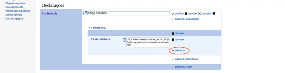A referência que vamos adicionar é o site da revista onde o artigo foi publicado. Por isso, selecionamos a propriedade "URL da referência" (P854) e inserimos o link em questão. Caso esteja satisfeito com essas informações, basta clicar em publicar.