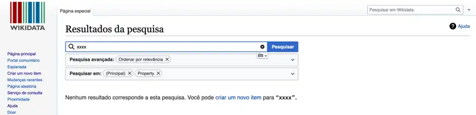 Para te auxiliar na hora de criar novos itens, acesse esta página e encontre uma lista com todas as propriedades que são atualmente mantidas na base de dados, separadas por grandes conjuntos temáticos. Note que é possível fazer uma busca direta por uma propriedade, basta digitar e clicar em "procurar uma propriedade", logo no começo da página. Você também pode navegar pelos conjuntos de propriedades para conhecer todas as opções disponíveis clicando em cada uma das caixas cinzas.