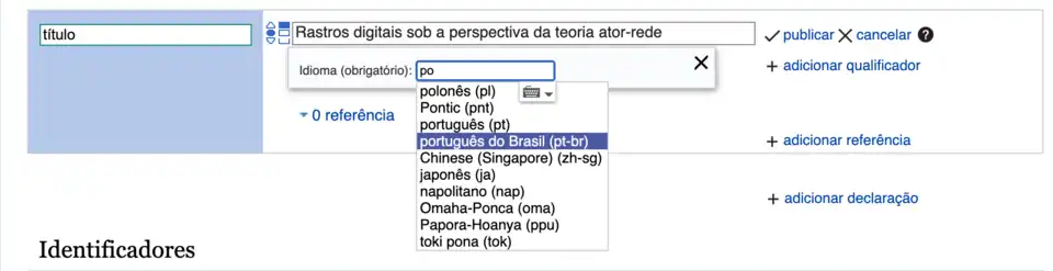 Aqui, escolhemos o idioma "português do Brasil (pt-br)". Note que ao digitar apenas as duas primeiras letras do idioma, o Wikidata abriu um menu suspenso com opções correspondentes. Basta escolher e clicar com o cursor ou apertar a tecla "enter". Não se esqueça de clicar em "publicar" quando finalizar a declaração em questão.