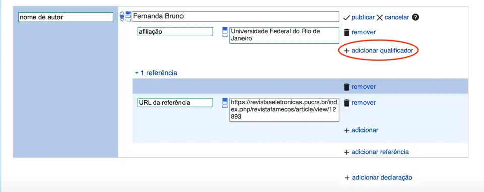 Na imagem abaixo é possível ver que adicionamos a propriedade "nome do autor" (P2093) e depois completamos o valor com o nome "Fernanda Bruno" → autora do artigo científico que estamos adicionando. A tripla ficou: artigo científico → nome do autor → Fernanda Bruno.