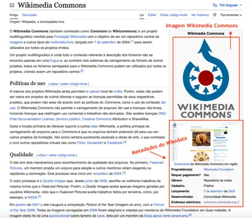 De maneira resumida, o Wikimedia Commons conversa com a Wikipédia auxiliando na ilustração dos seus verbetes. Junto ao Wikidata, que permite a estruturação dos metadados, a produção da caixa de informações nos verbetes da Wikipédia é facilitada pela interação entre essas três plataformas, como pode ser visto no exemplo da imagem ao lado. A caixa de informações extrai a imagem do Commons e os metadados do Wikidata, como é possível ver na imagem acima onde está reproduzido o verbete sobre o Wikimedia Commons.