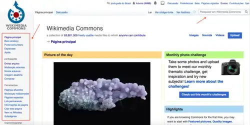 Ao acessar o Commons, você encontrará uma página semelhante à representada na imagem abaixo. Do lado esquerdo, há uma série de links clicáveis, como para voltar à página principal, acessar o portal comunitário, a página de ajuda, entre outros. Na mesma tela, também encontra links rápidos para participação na comunidade do Wikimedia Commons como "Enviar arquivo", por exemplo, e na parte central, informações divididas por caixas: imagem do dia, desafio da foto do mês, destaques, mídia do dia, conteúdo e participação.