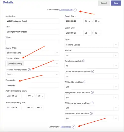 Do lado direito da tela, vemos outra caixa branca com o título "Details" (Detalhes). Nela, estão elencadas as informações do programa. Em "Facilitators" (Facilitadores) vemos todos os usuários inseridos nessa função – AJurno (WMB), nesse caso. Em "Institution" (Instituição) vemos a instituição inserida na criação da página do programa – Wikimedia Brasil. Em "Home Wiki" (Wiki Principal) vemos que a Wikipédia em Português foi inserida como wiki principal de rastreamento neste programa. Em "Tracked Wikis" (Wikis rastreadas) estarão listadas todas as wikis pré-selecionadas para serem rastreadas e em "Tracked Namespaces" (Domínios rastreados) todos os domínios de usuário pré-selecionados para serem rastreados. Em seguida, lê-se "Passcode" (Senha de acesso), que nesse caso é "mtnugqic". Depois, vemos "Activity tracking start" (Início do rastreamento das atividades) e "Activity tracking end" (Fim do rastreamento das atividades) seguidos de uma data no formato Ano-Mês-Dia e Horário. Caso tenha optado por colocar um horário de evento específico, serão exibidas as informações "Event Start" (início do evento) e "Event End" (fim do evento) em seguida. A última informação na caixa "Details" são as "Campaigns" (Campanhas) nas quais a página do programa está inserida. Como padrão, todos os programas são inseridos na campanha "Miscellanea" (Miscelânea).