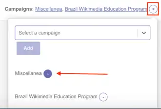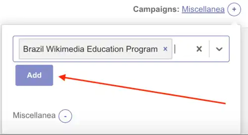 Ao clicar nesse espaço, abrirá um menu suspenso com algumas opções de campanhas. Recomendamos que selecione a campanha Brazil Wikimedia Education Program. Basta digitar as primeiras letras deste nome que as opções aparecerão no menu suspenso. Selecione e será inserida na caixa de texto, conforme ilustrado na imagem abaixo.