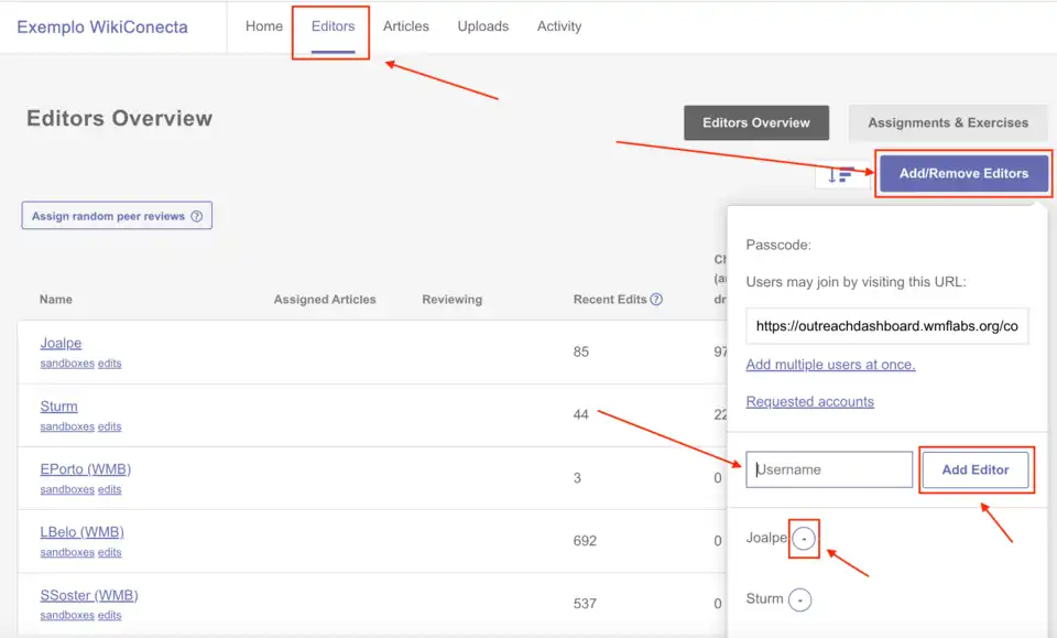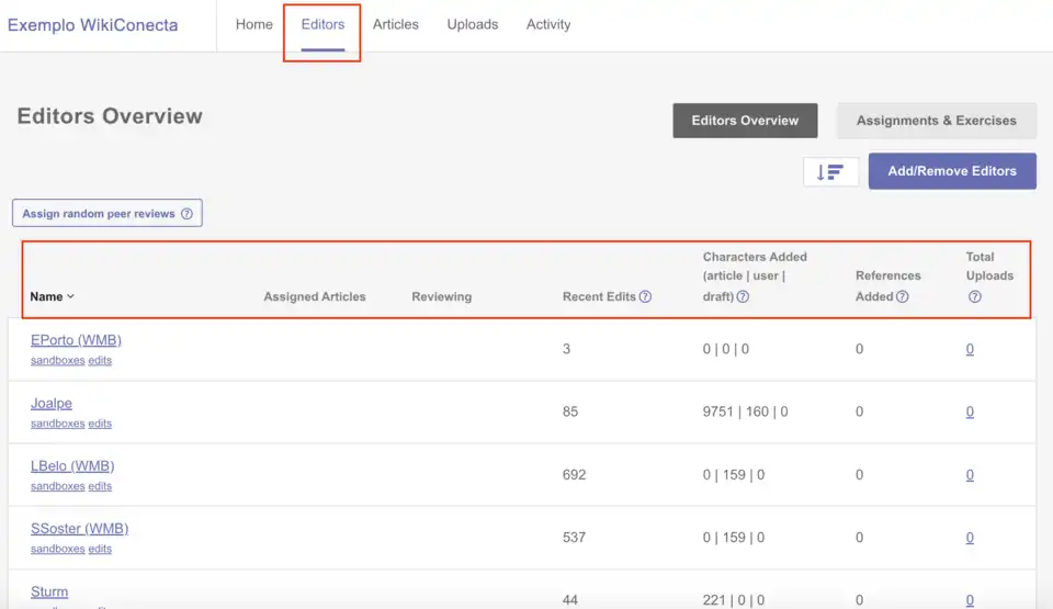 Na aba "Editors" (Editores), do menu superior, são exibidas as edições feitas individualmente por cada um dos usuários cadastrados na página do programa, conforme exemplificado na imagem abaixo. É possível acompanhar o desempenho individual dos participantes através das duas abas disponíveis no menu secundário da página: "Editors Overview" (Visão geral dos editores) e "Assignments & Exercises" (Designações e Exercícios).
