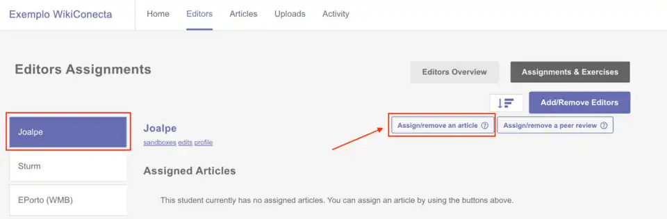 Em seguida, clique em "Assign/Remove an Article" (Designar/Remover um Artigo) para adicionar um artigo (verbete) a um usuário específico. Para isso, basta inserir o título do artigo desejado ou sua URL na caixa de texto "Add one article title or URL per line" (Adicione um título de artigo ou URL por linha).