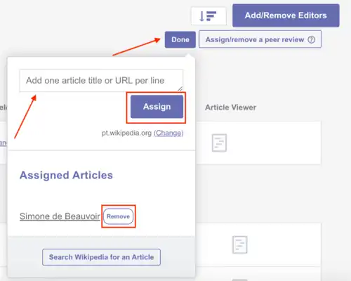 Ao adicionar o artigo desejado, clique no botão roxo "Assign" (Designar), abaixo da caixa de texto, para salvar a seleção. Os artigos designados a esse usuário aparecerão elencados logo abaixo, na mesma janela, na área "Assigned Articles" (Artigos designados). Na imagem acima, vemos que o usuário selecionado tem o verbete "Simone du Beauvoir" designado a ele.