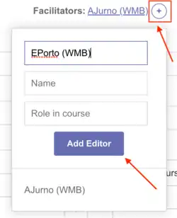 Para adicionar um facilitador, digite o nome de usuário que deseja adicionar no primeiro espaço em branco, onde lê-se "Username" (Nome de usuário), conforme mostrado na imagem acima. Opcionalmente, você pode adicionar o nome verdadeiro da pessoa (Name) ou o papel dela no programa (Role in course). Em seguida, clique no botão roxo "Add Editor" (Adicionar Editor), conforme indicado na imagem acima.