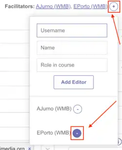 - Facilitador é qualquer colaborador com permissões técnicas para controlar a página do programa. Devem ser inseridos como facilitadores pessoas que podem ajudar na manutenção da página, como os wikimedistas voluntários que te auxiliam.