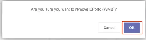 Ao fazê-lo, abrirá uma janela como a exibida a seguir: "Você tem certeza que deseja remover EPorto (WMB)?". Você pode clicar em "Cancel" (Cancelar), caso queira desistir da remoção, ou no botão roxo "OK" para remover o facilitador, conforme indicado abaixo.