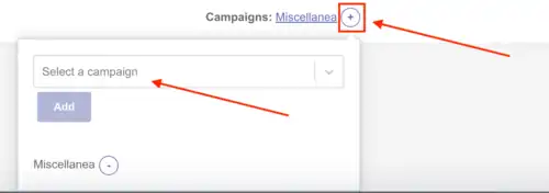 Clique no sinal de + na frente do nome da campanha para abrir a janela de edição conforme indicado acima. Em seguida, procure pelo nome da campanha no espaço "Select a campaign" (Selecionar uma campanha), conforme indicado pela segunda seta na imagem acima.