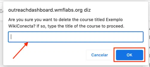 "Você tem certeza que quer deletar o curso intitulado XXX? Se sim, digite o título do curso para continuar", conforme ilustrado na imagem abaixo, em que XXX é o nome da sua página de programa.