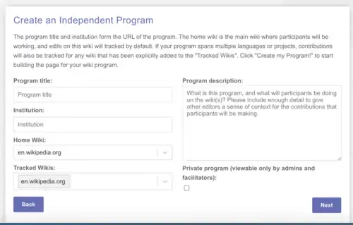 Note que há uma caixa de seleção abaixo da descrição do programa. Trata-se da opção "Private program (viewable only by admins and facilitators" (Programa privado - visível apenas por administradores e facilitadores). Essa opção serve para preservar a identidade dos participantes, tornando a lista de usuários participantes visível apenas para usuários com funções administrativas na página do programa. Deve ser usada em casos de edição de assuntos sensíveis. Por exemplo, ao editar conteúdos ligados à comunidade LGBTQIA+ em países em que a homossexualidade é criminalizada, preservando a identidade dos participantes envolvidos, ou para editar conteúdos de caráter político em Estados ditatoriais. Vale ressaltar que essa opção não invisibiliza as demais métricas do programa que seguem sendo publicamente visíveis.