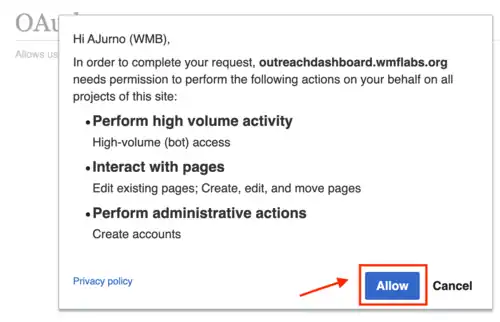 Ao fazer seu login, será exibida uma janela pedindo permissão para que o Dashboard interaja com páginas usando a sua conta sem a necessidade de fornecer a senha de acesso toda vez. Isso porque a ferramenta usa o OAuth para fazer o login na plataforma com a conta de usuário da Wikipédia (via login unificado). OAuth é diminutivo de open authorization, em inglês, e é um protocolo usado por diversos sites para autorizar aplicativos externos a realizarem edições e outras ações em seu nome.