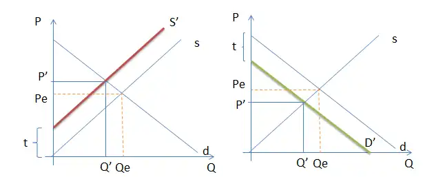 A imagem de cima mostra no primeiro gráfico a incidência do imposto (t) sobre os produtores e no segundo sobre os consumidores. O resultado é o mesmo: o consumo de Q unidades em vez de Qe.