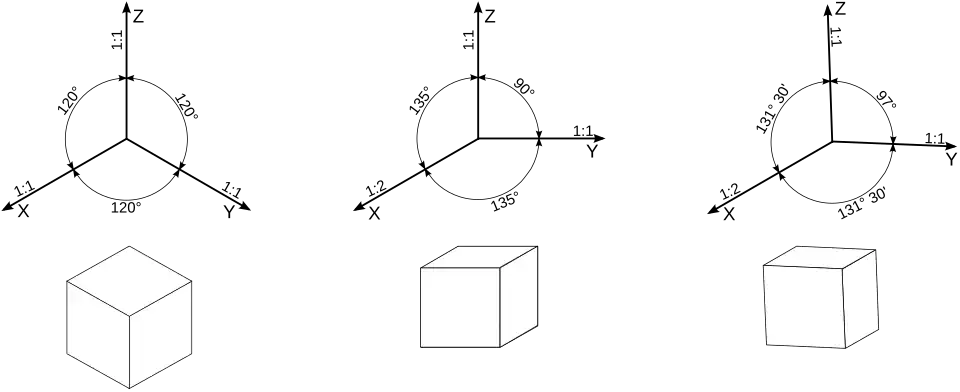 - As retas paralelas representam-se paralelas, em vez convergirem para um ponto de fuga.