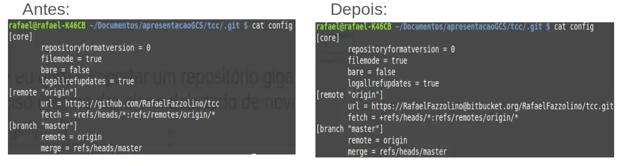 Feito isso, seu repositório já estará presente no servidor do Bitbucket. Para facilitar a importação de repositórios com grande volume de dados, o usuário pode optar por modificar o arquivo config presente na pasta .git de seu repositório local, modificando a url do GitHub para a url do repositório do Bitbucket. Esta modificação faz com que o usuário não precise clonar todo o repositório novamente, utilizando o mesmo repositório local já utilizado. Um exemplo desta modificação no arquivo config pode ser visto na imagem a seguir.