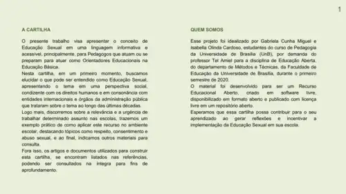 Esta página foi criada para divulgar o Recurso Educacional Aberto intitulado "Educação Sexual: cartilha para Orientadores Educacionais", desenvolvido por Gabriela Cunha Miguel e Isabella Olinda Cardoso, estudantes do curso de Pedagogia, durante o primeiro semestre de 2020, para a disciplina de Educação Aberta, ministrada pelo professor Tel Amiel, vinculada ao Departamento de Métodos e Técnicas da Faculdade de Educação, da Universidade de Brasília (UnB).