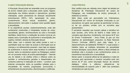 Visamos apresentar o conceito de Educação Sexual em uma linguagem informativa e acessível, principalmente, para Pedagogos que atuam ou se preparam para atuar como Orientadores Educacionais na Educação Básica. Em um primeiro momento, buscamos elucidar o que pode ser entendido como Educação Sexual, apresentando o tema em uma perspectiva social, condizente com os direitos humanos e em consonância com entidades internacionais e órgãos da administração pública que trataram sobre o tema ao longo das últimas décadas. Discorremos sobre a relevância e a urgência de trabalhar determinado assunto nas escolas, trazemos um exemplo prático de como aplicar este recurso no ambiente escolar, destacando tópicos como respeito, consentimento e abuso sexual, e indicamos outros materiais para consulta. Fora isso, os artigos e documentos utilizados para construir a cartilha, se encontram listados nas referências, podendo ser consultados na íntegra para fins de aprofundamento.