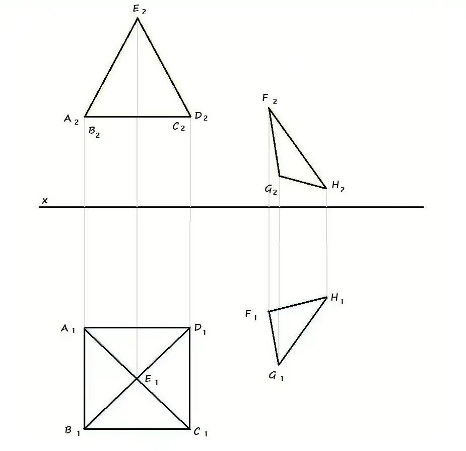- A distinção das projecções de entidades (pontos, rectas, figuras, etc.) é feita através da junção de um índice ao nome da entidade, 1 para a projecção horizontal, 2 para a projecção frontal.