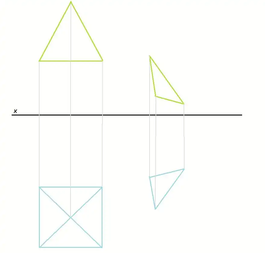 As projecções da pirâmide e o triângulo que já representámos aparecem com cores diferentes, mas como os desenhariamos com lápis na folha?