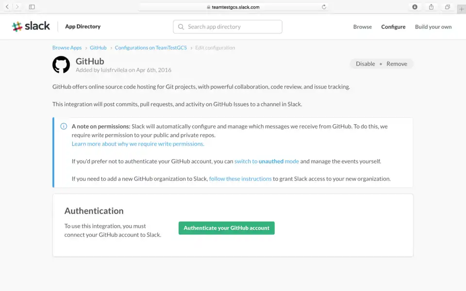 8. Terminados os passos a integração está pronta para ser usada, e as notificações ide commits e push chegam automaticamente no canal do time.