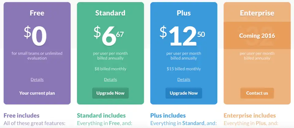 O Slack possui 4 tipos de planos, Free, Standard, Plus e Enterprise.