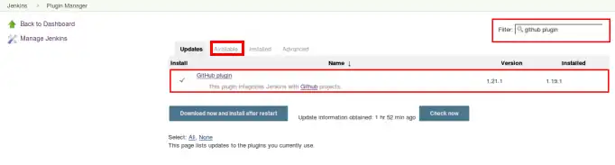 - Na aba Avaiable, habilite o Git Plugin e GitHub, depois clique em Download now and install after restart ;