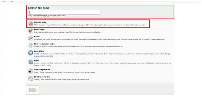 - Na próxima tela, crie um nome para o Job, escolha a opção 'Freestyle project'.