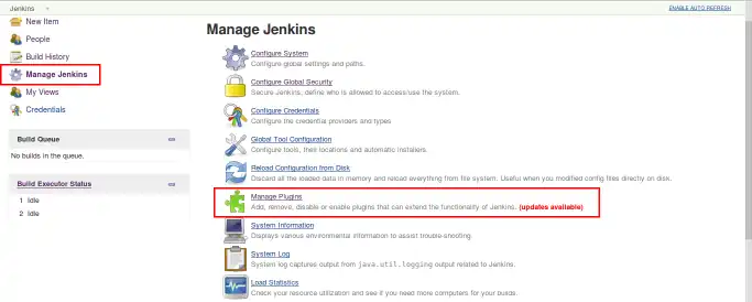 - Na página inicial do Jenkins clique em Manage Jenkins -> Manage Plugins;