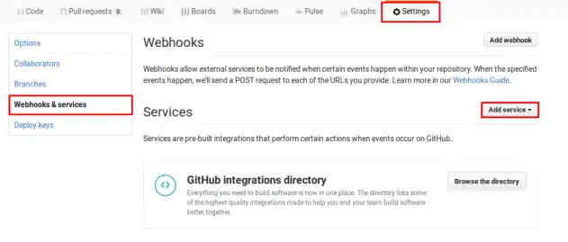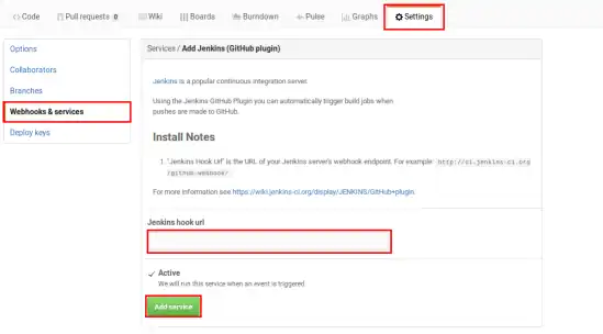 - Clique em Settings--> Webhooks&Services--> Service--> Add Services--> Selecione "Jenkins (GitHub plugin)" --> Add service.