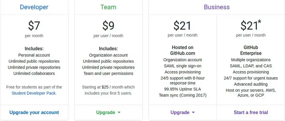 O GitHub possui planos gratuitos e pagos. Optando pelo plano gratuito, o desenvolvedor não poderá ter direito a certas regalias que a plataforma oferece. Uma prova disso são os repositórios privados, onde para poder usufruir desse recurso, o desenvolvedor terá ao menos que ter adquirido o plano pago mais básico ou ter um plano de estudante.
