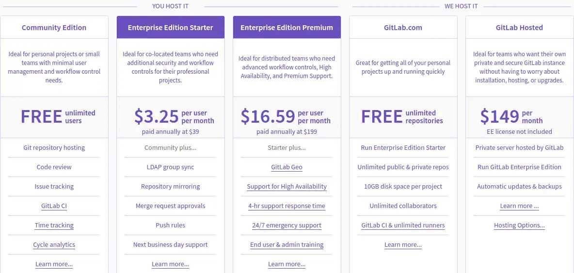 - GitLab Enterprise Edition: Paga, aplicação auto-hospedada, inclui diferentes funcionalidades e suporte.