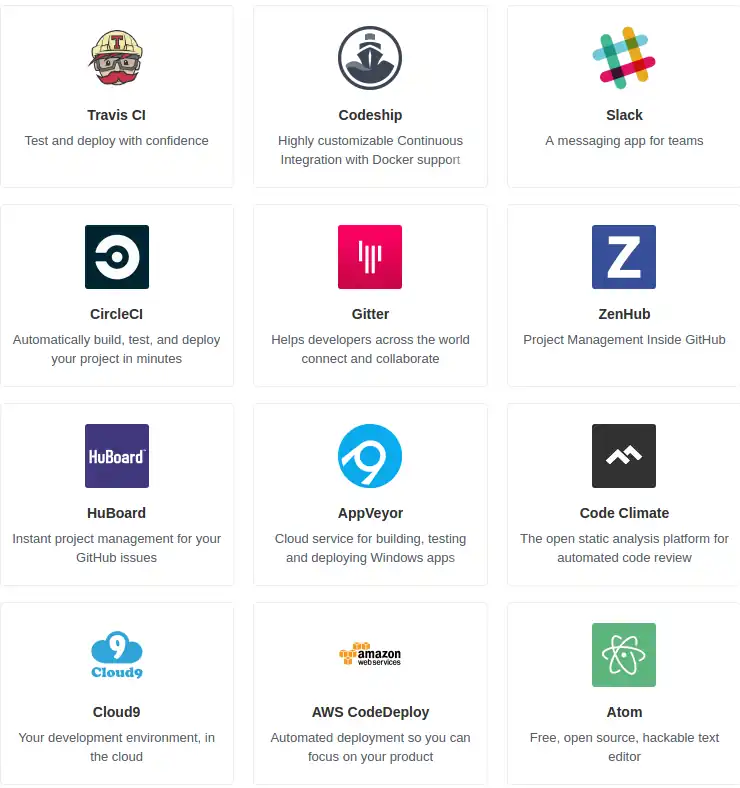 Um dos pontos fortes do GitHub é a vasta quantidade de ferramentas de integração disponíveis para a plataforma. Dando a possibilidade ao desenvolvedor a oportunidade de poder integrar seus projetos a essas ferramentas.
