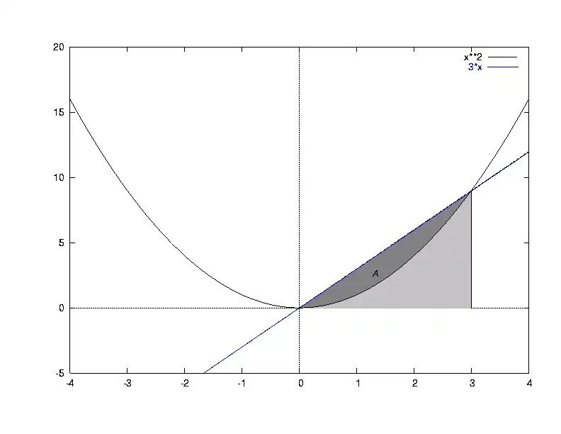 Vamos calcular a área da região delimitada pelas curvas entre as suas interseções. O gráfico abaixo representa as funções e a área que desejamos calcular, a qual chamamos de A: