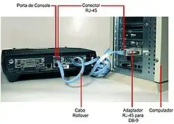 A primeira configuração do roteador Cisco 1700 deve ser feita através da porta serial do micro e da porta Console ou Aux do roteador pois o mesmo vem sem a configuração IP, para configurações posteriores pode-se usar a porta ethernet do computador com uma porta ethernet do roteador utilizando-se o protocolo Telnet para comunicação entre os equipamentos. Realizado as conexões físicas, porta serial do micro ligado por um cabo Rollover na porta Console do roteador Cisco 1700 (figura 1), e ligados os equipamentos pode-se utilizar do emulador de terminal (Hyper Terminal) para conectar logicamente o computador no roteador.