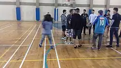 * Delimitou um espaço de um quadrado da quadra porém os alunos deveriam continuar andando como se fosse um círculo, a adição dessa regra teve o intuito de deixar os alunos mais próximos, dando mais dinâmica a atividade.
